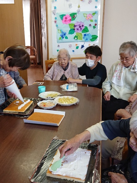 いきいき東豊中では、全員同じ祝い方ではなく、それぞれに合わせた形でお祝いしており、今回はみんなで生メロンたっぷりのショートケーキを作ってお祝いです。