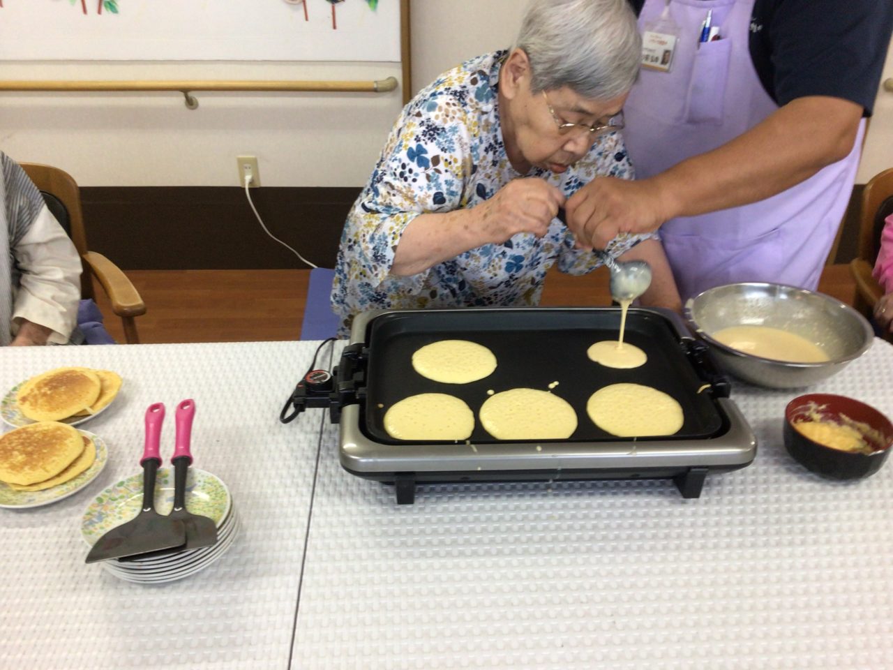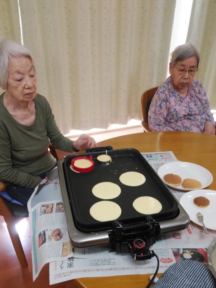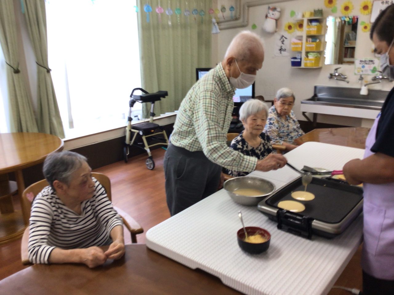 お馴染みのホットケーキ作りですが、涼しくなってきたので夕涼みしながらのおやつタイムです。