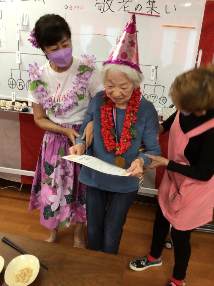 敬老会で行った豆移しゲームでは、優勝者に表彰状を進呈したところ、感激のあまり涙ぐんでまでおられました。