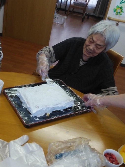 ケーキをみんなで作り、家族様もご一緒に盛大に祝わせて頂きました。